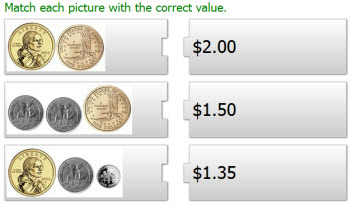 In this online activity, elementary school students will match the pictures of different groups of US coins with the money amount written in decimal form.